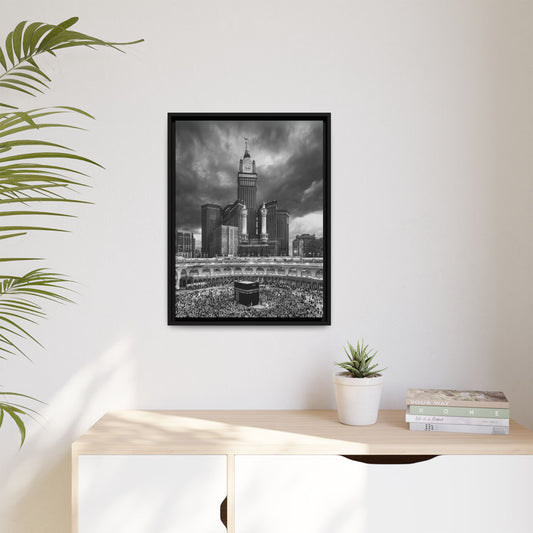 Black & White Makkah Clock Tower & Kaaba – Framed Canvas
