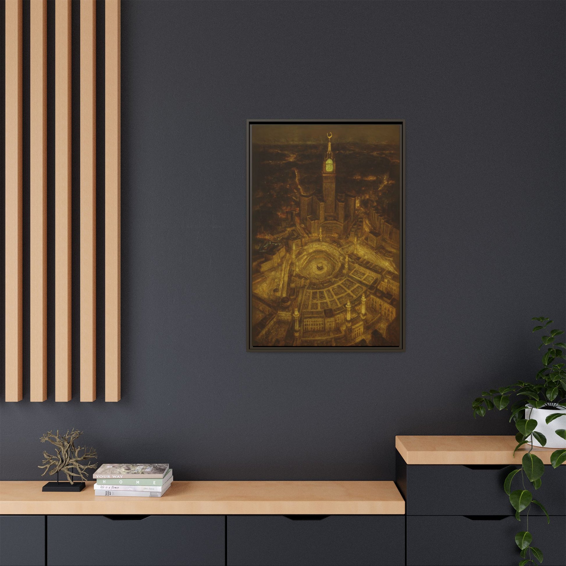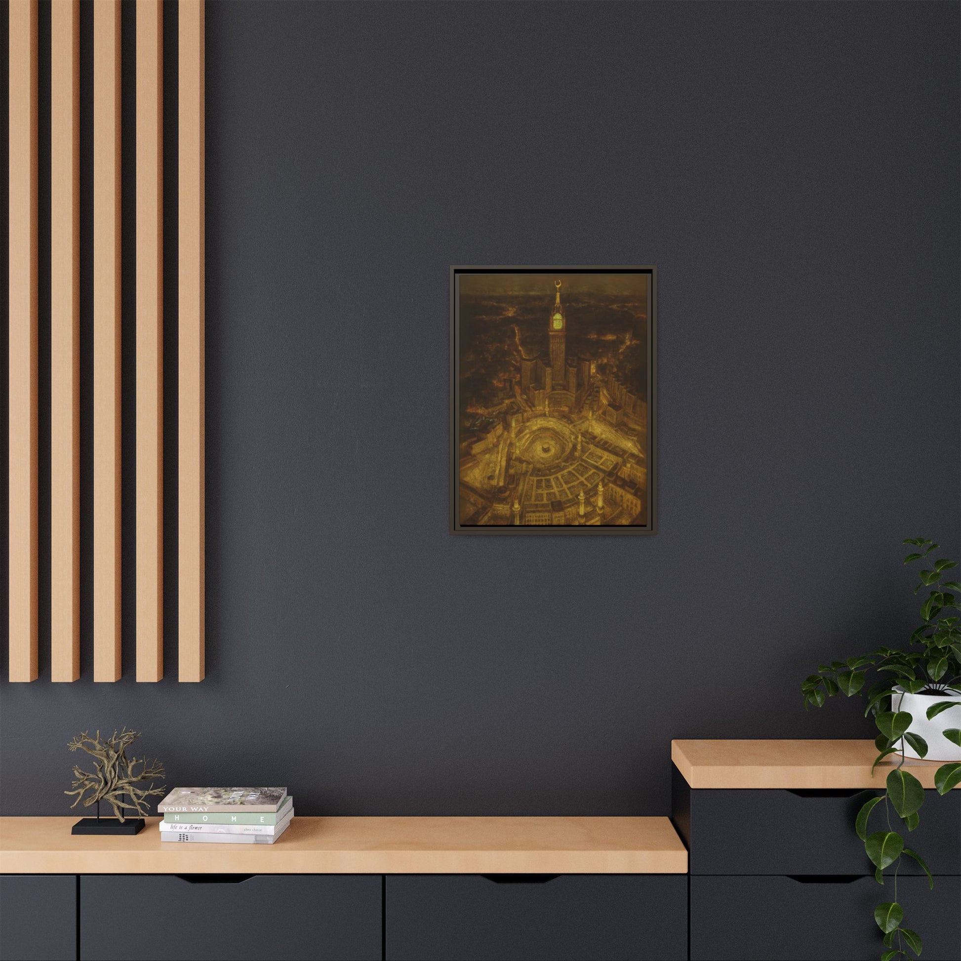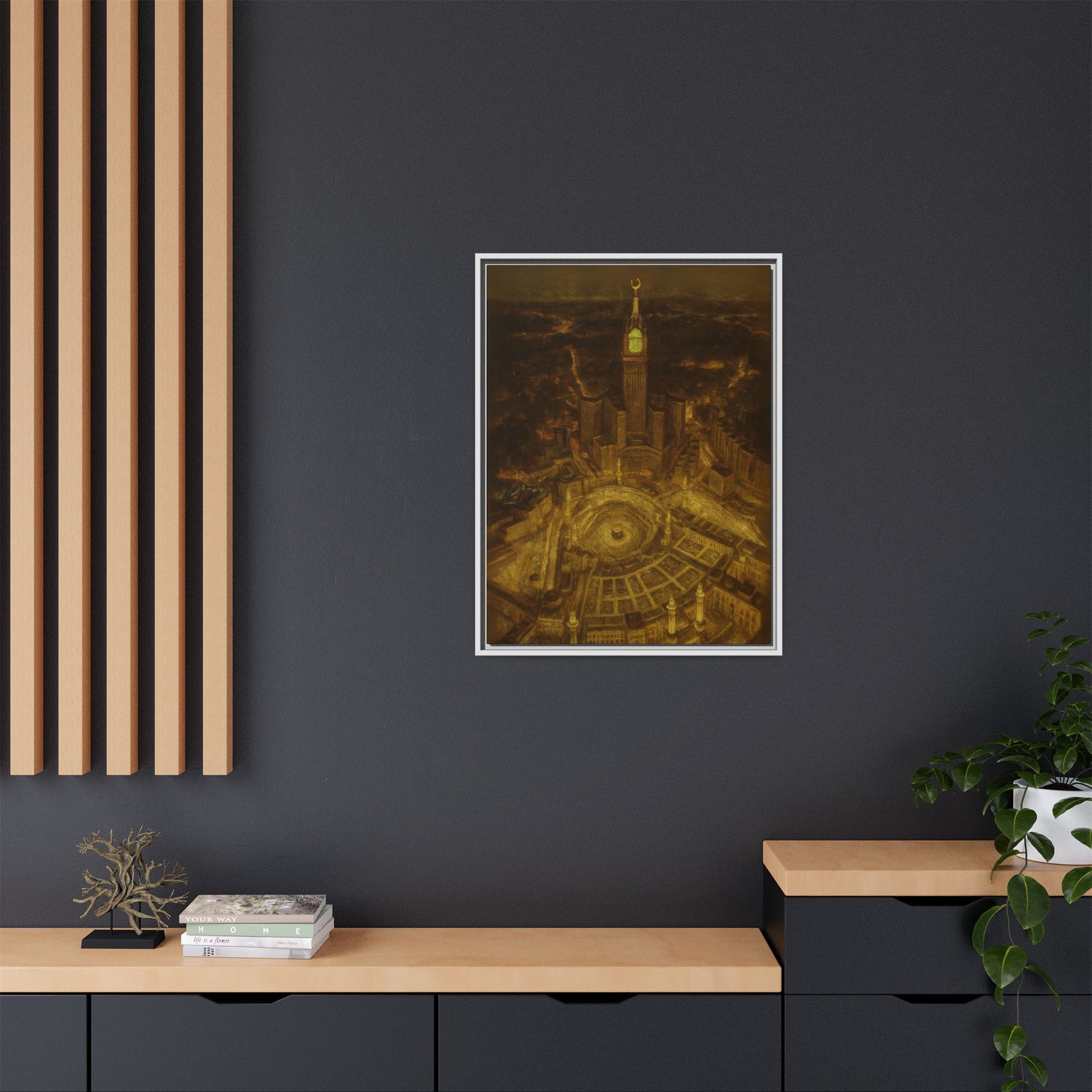 Experience the beauty of Makkah at night with this golden aerial Kaaba and Clock Tower framed canvas. A serene Islamic wall art for elegant Muslim homes.