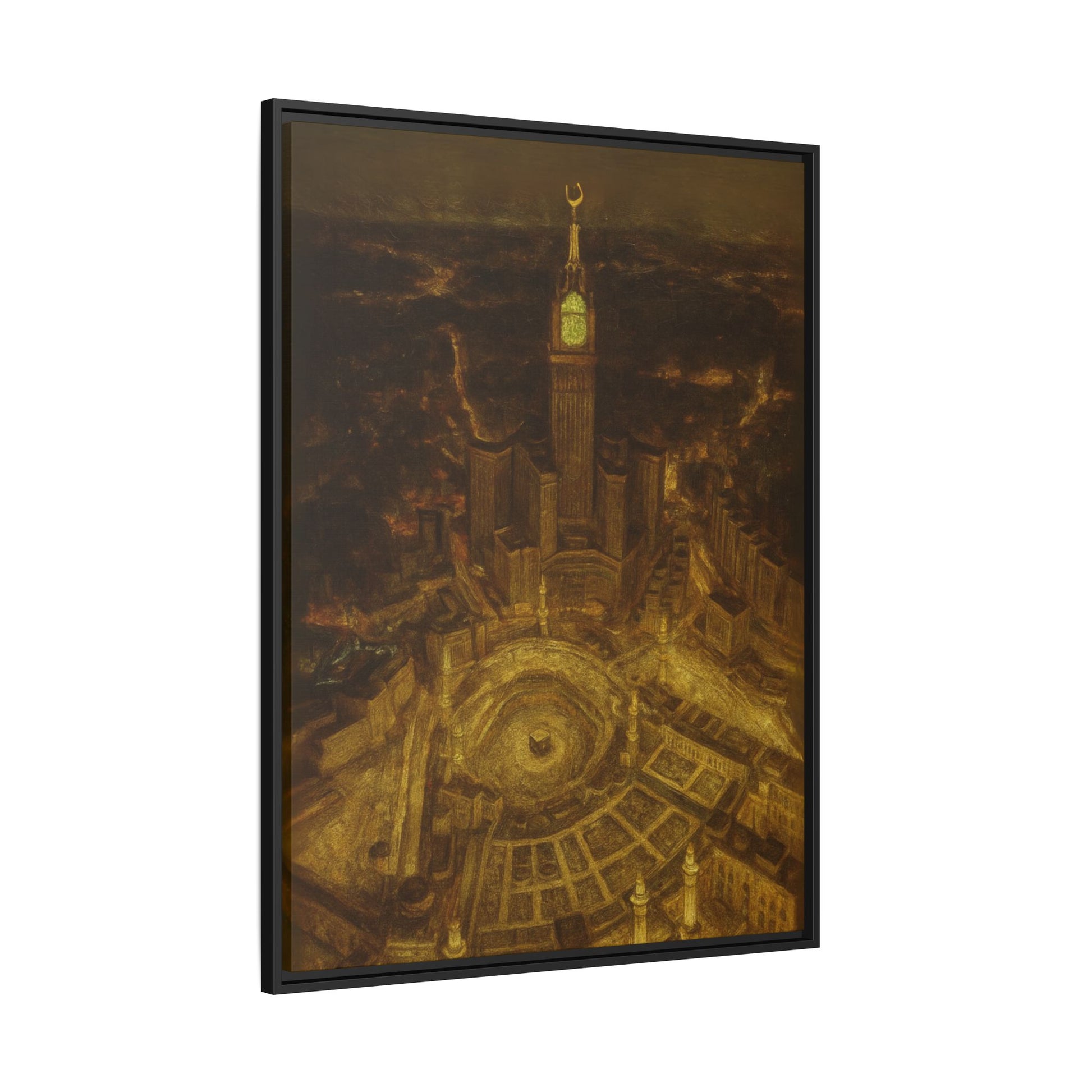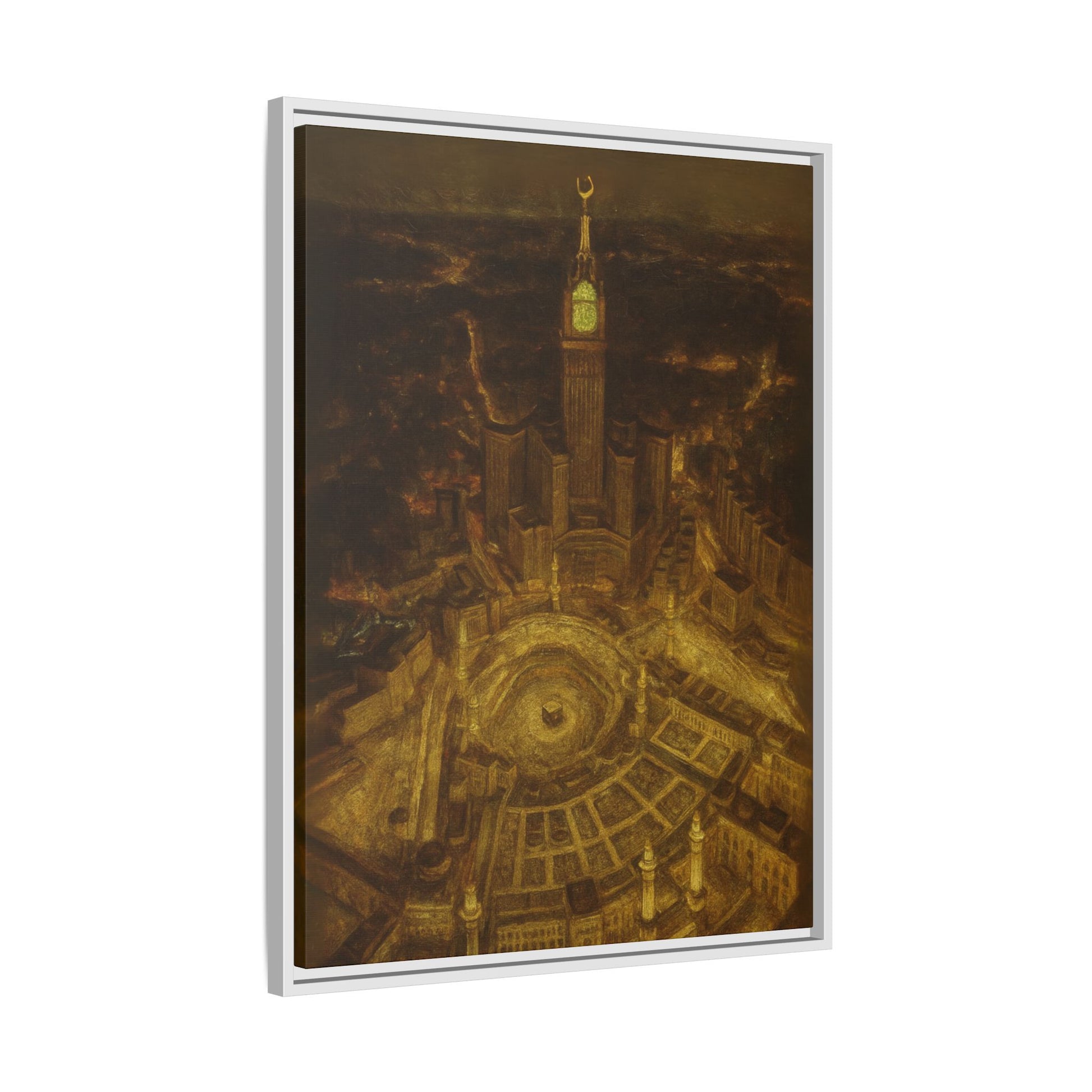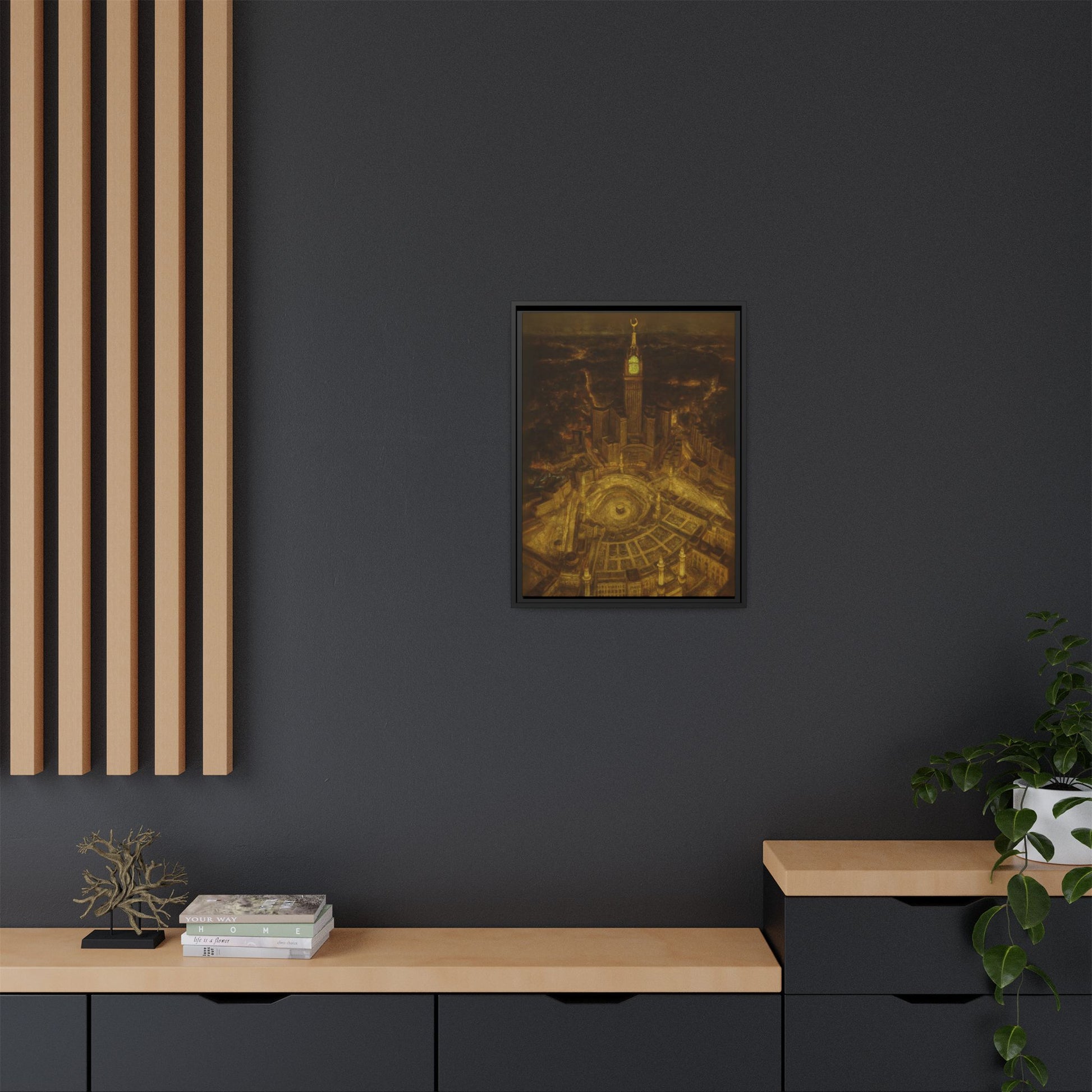 Experience the beauty of Makkah at night with this golden aerial Kaaba and Clock Tower framed canvas. A serene Islamic wall art for elegant Muslim homes.